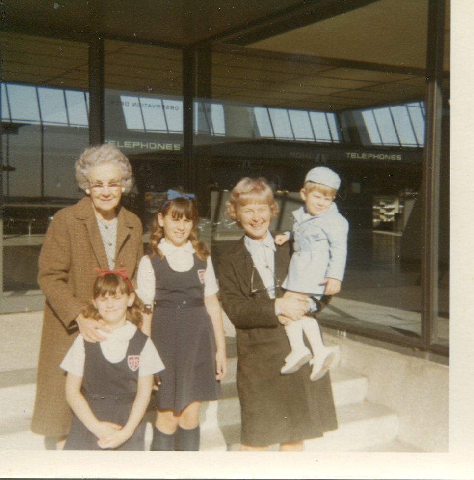 Dulles Airport c. 1970. Both my grandmothers, Barb, Chris and me. Sending them off to Sydney… again.
