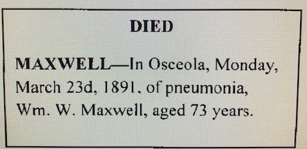 Then last fall, I dragged Valerie with me to western Wisconsin to finish researching these ancestors in the hopes of coming home with more information to complete a supplemental DAR application for Thompson Maxwell. My 3rd great grandfather, William Whaley Maxwell, left this world in 1891 with his parents’ names blank on his death certificate. That omission has created a lot of trouble for me, but it’s also taken me on a journey that has probably been more rewarding in the long run. I’ve discovered more about them than I would have if his parents’ names had been listed or if he had a normal obituary: